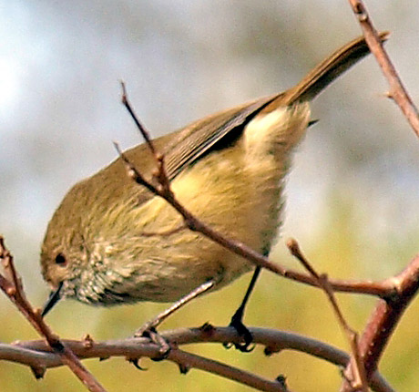 below and behind the eye, and has yellow-buff flanks; call is insect-like