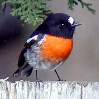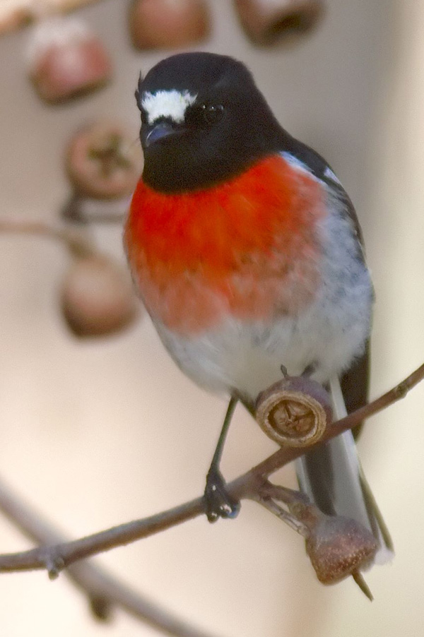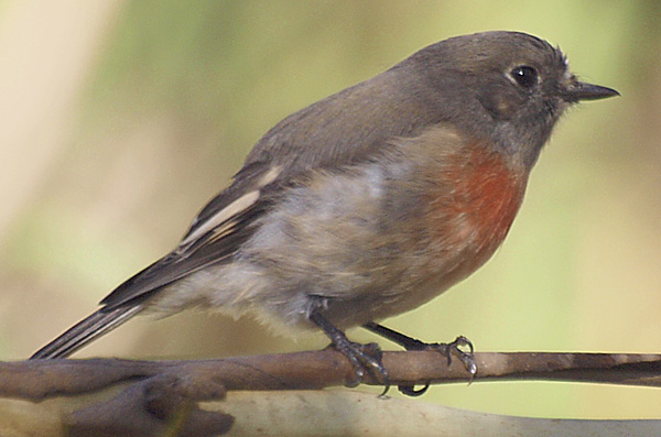 Female is browner with pale scarlet wash on breast. Usually in pairs.