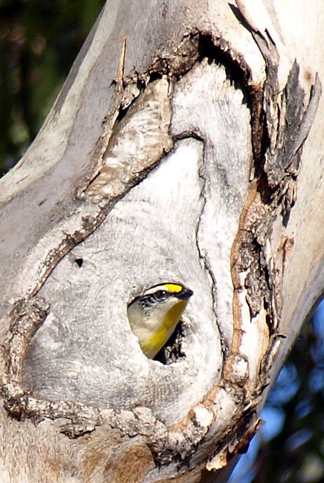 yellow throat, pale underparts and olive back. Nests in tree hollows