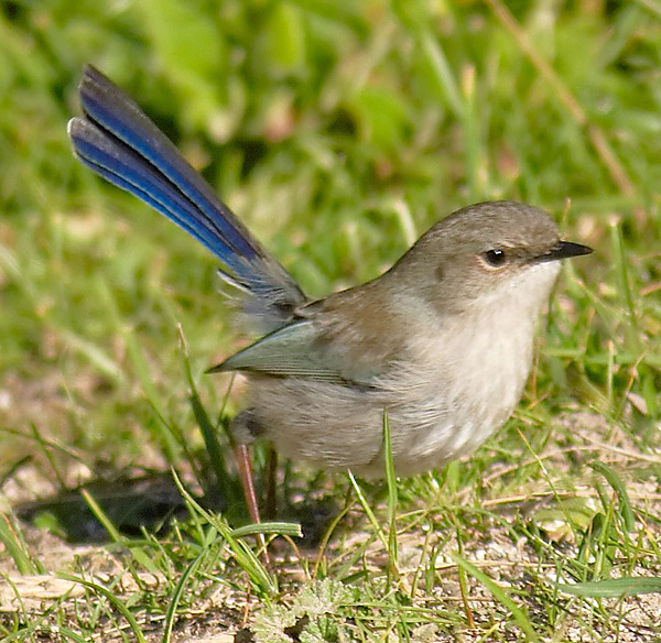 bill, blue tail. Travel in family groups, often on ground or in shrubs,